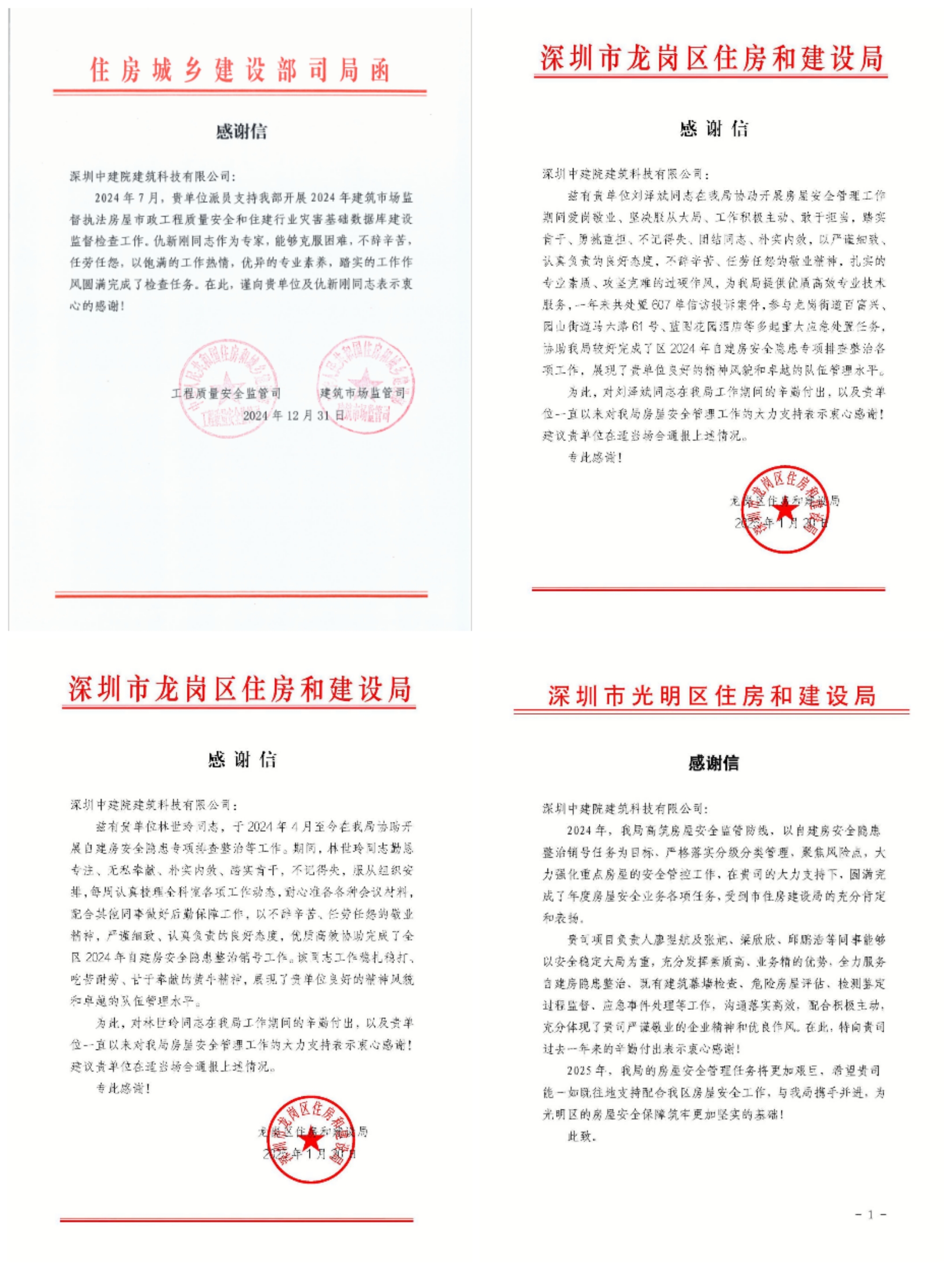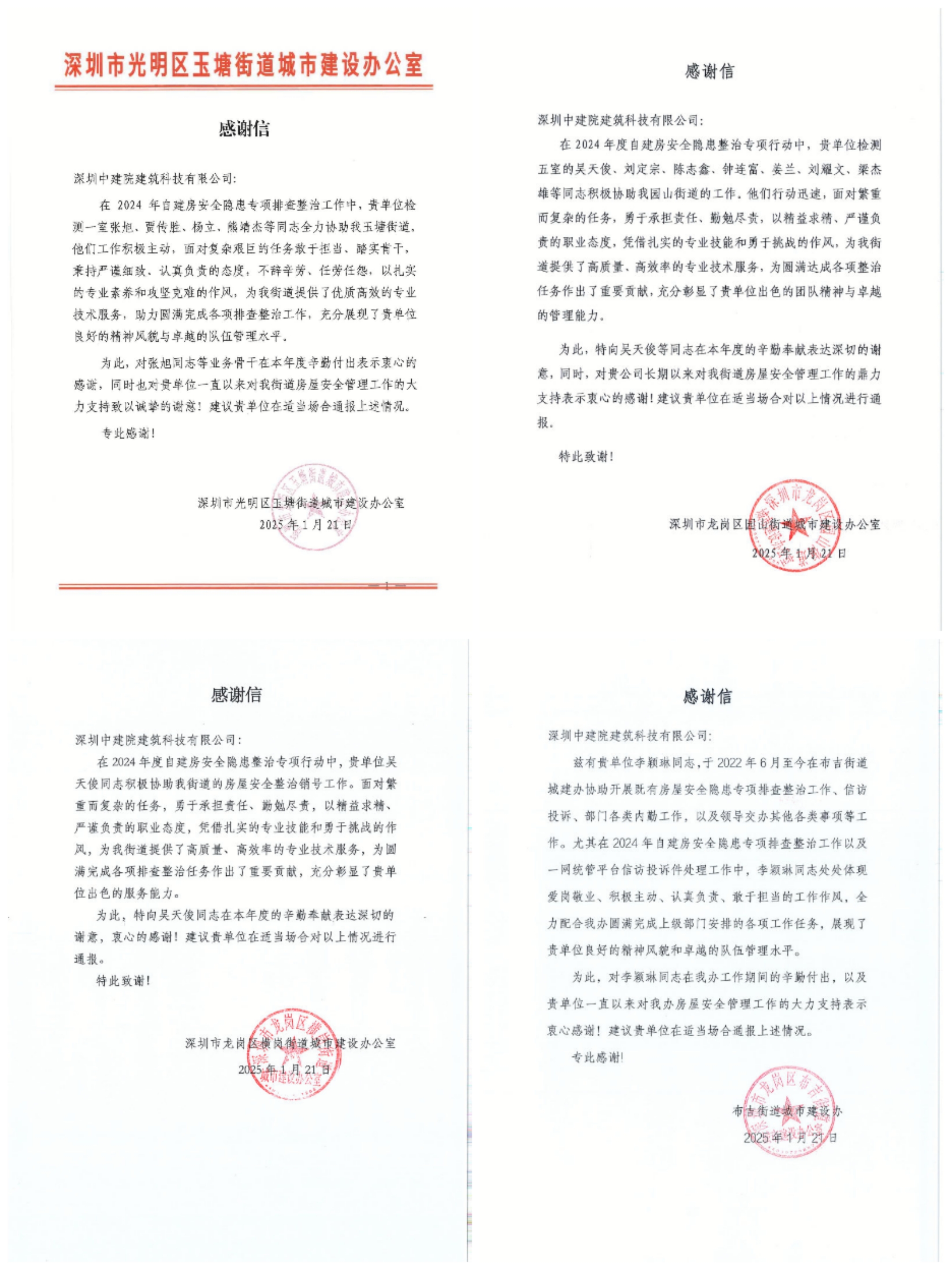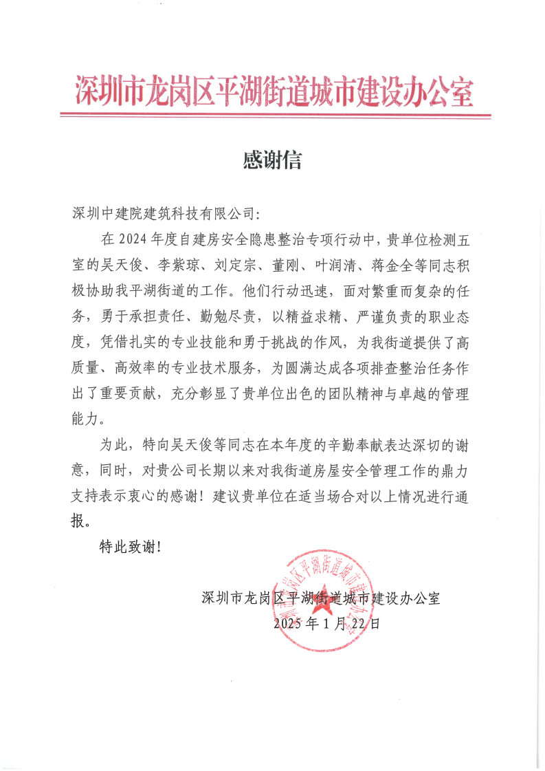 ?近日,中國建研院深圳分公司所屬深圳中建院陸續收到多封沉甸甸的感謝信——來自住房城鄉建設部工程質量安全監管司、建筑市場監督司,深圳市光明區住房和建設局、龍崗區住房和建設局,及玉塘街道、園山街道、橫崗街道、布吉街道、平湖街道、新橋街道等政府部門。信中向深圳中建院在2024年建筑市場監督執法房屋市政工程質量安全、住建行業災害基礎數據庫建設監督檢查工作中所作出的貢獻,以及多年來對深圳市區住建部門、街道等轄區主管部門在房屋安全管理工作的默默付出表示感謝。